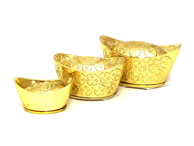 Modeled after ancient Chinese currency, these replica metal ingots are believed to attract good fortune and prosperity.
